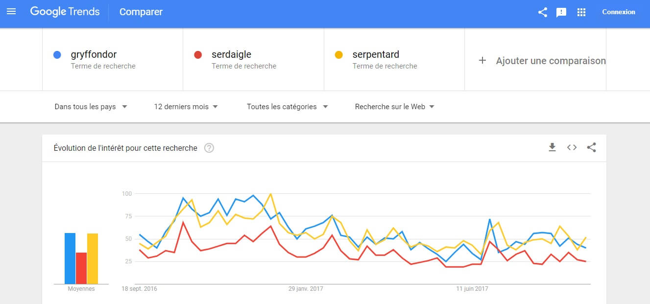 Google Trends affiche les changements du volume des recherches pour les sujets, termes de recherche et entités que vous désirez. La maîtrise de cet outil peut maintenir votre contenu en avance sur la concurrence. Pour le Search Engine Marketing, il est très important d’analyser les changements sur le comportement des requêtes. Cela peut même servir aux blogueurs pour leur article quotidien, en voyant exactement quel sujet est populaire.