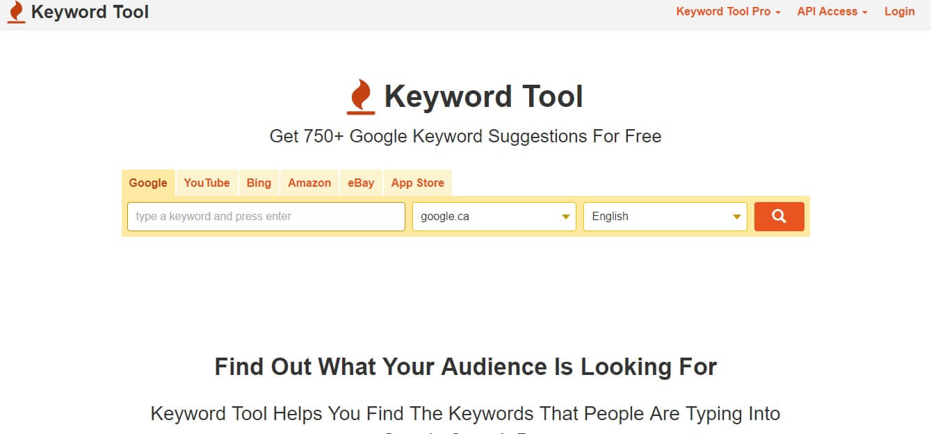 Cet outil freemium est excellent si vous voulez quelque chose qui soit rapide et simple à utiliser pour obtenir une tonne d’idées de mots-clés. Un aspect unique de cet outil est que vous pouvez l’utiliser pour Google, YouTube, Bing, Amazon et les mots-clés de l’App Store. Keywordtool.io est particulièrement utile pour les mots-clés de longue traine qui ne s’afficheront pas dans Google Keyner Planner, en raison du faible volume de recherche. Un autre outil similaire à celui-ci, Ubersuggest.