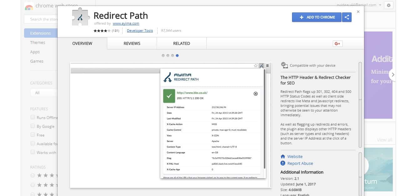 Redirect Path est une extension gratuite de Google Chrome qui vous aide à découvrir les en-têtes HTTP et les erreurs de redirection afin de pouvoir consacrer plus de temps à résoudre les problèmes plutôt que de les rechercher. Ce plugin est le plus pratique si vous recherchez simplement à analyser quelques pages.