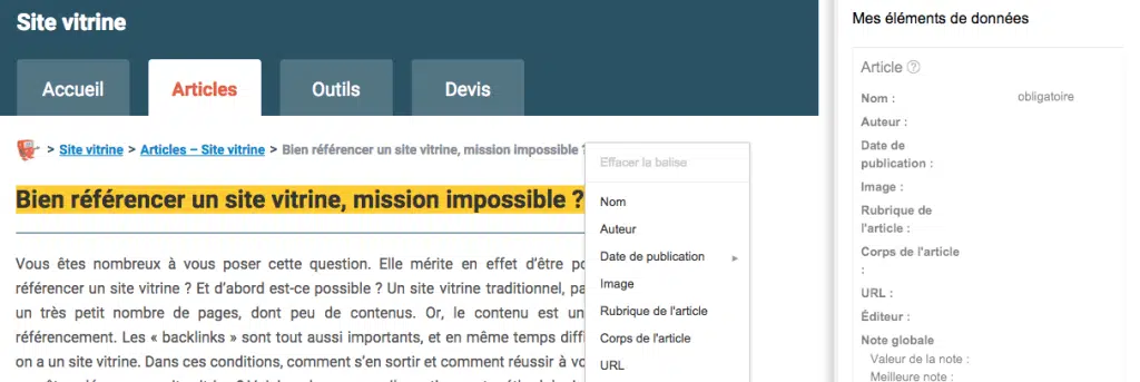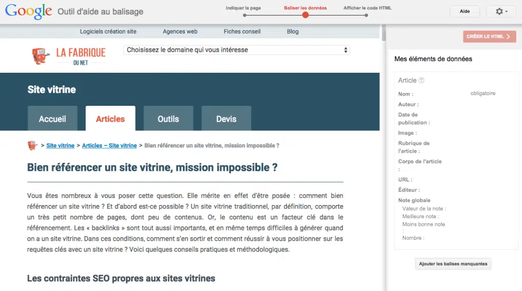 Sélectionnez ensuite le type de données que vous souhaitez structurer. Dans notre exemple, nous choisissons de structurer les données d’un article. Ensuite, copiez-collez l’URL de la page (de l’article) dont vous souhaitez enrichir le code. Si votre contenu n’a pas d’URL (l’article n’est pas encore en ligne par exemple), vous pouvez directement copier-coller le code HTML en cliquant sur « HTML ». Dans notre exemple, nous avons choisi de structurer le contenu de notre article sur le référencement des sites vitrines. Cliquez ensuite sur « Commencer le balisage ». La page de votre contenu apparaît alors dans la partie gauche de l’écran et les différents éléments de données à gauche. Il s’agit de l’espace de travail à partir duquel vous allez pouvoir réaliser le balisage sémantique :