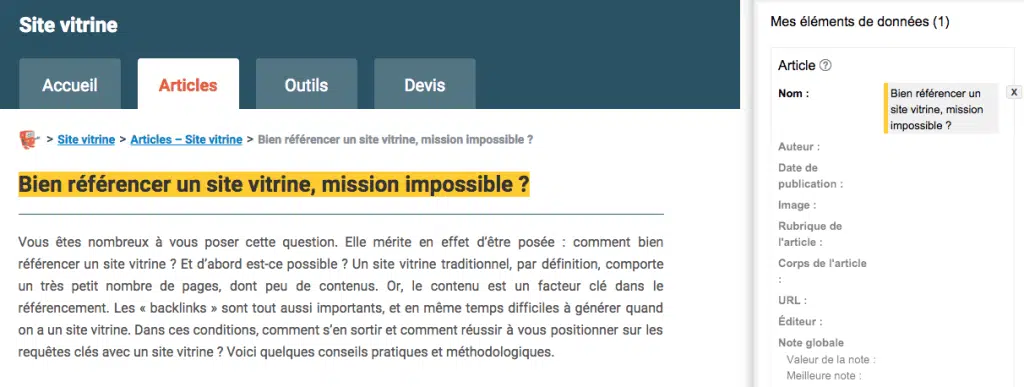 Pour celles et ceux qui n’ont toujours pas compris la logique du balisage sémantique, le fait de mettre une balise sémantique sur le titre va vous permettre de bien faire comprendre aux moteurs de recherche qu’il s’agit du titre de l’article. Après avoir cliqué sur « Nom », le titre de l’article apparaît dans la partie « Mes éléments de données » :