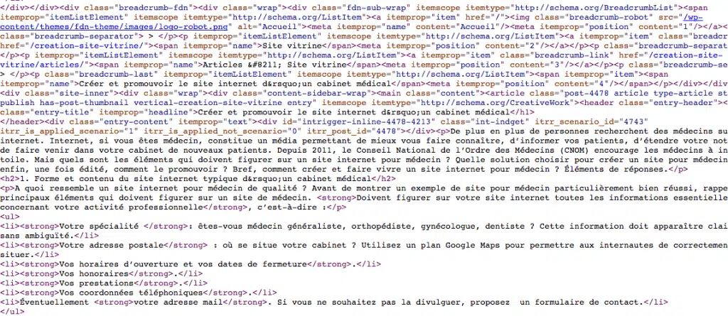 Le langage HTML utilise des dizaines de balises différentes : h1, h2, h3, div, img, meta, span, alt, script, embed, li, strong, etc. Voici une partie du code HTML d’une page de La Fabrique du Net :