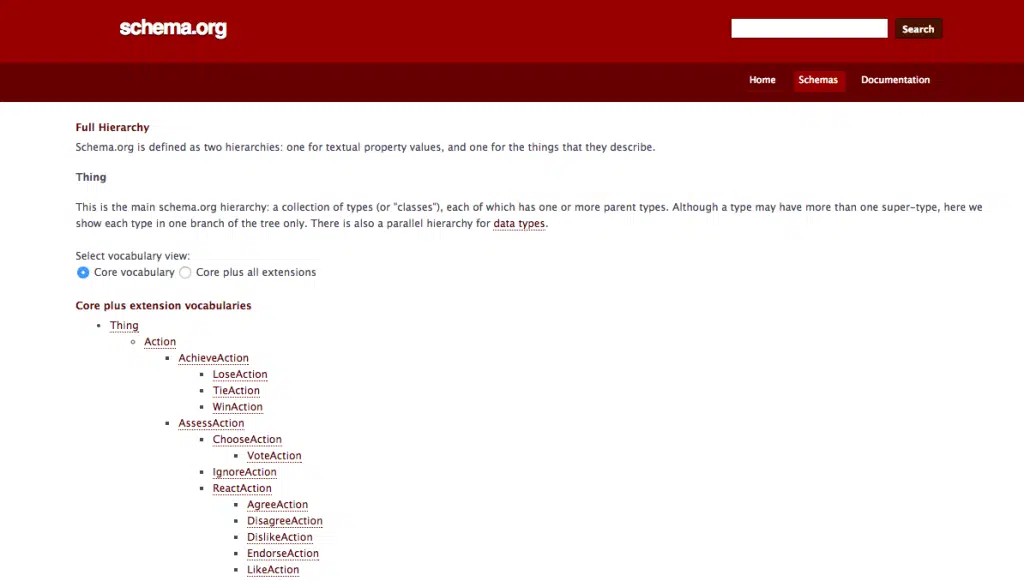 Une fois que vous vous serez familiarisé avec l’outil d’aide au balisage de Google, nous vous conseillons de vous rendre sur le site Schema.org. Ce site répertorie des centaines de nouveaux éléments de balisage et vous permet donc d’aller plus loin.. Voici à quoi ressemble la liste complète des types d’éléments :