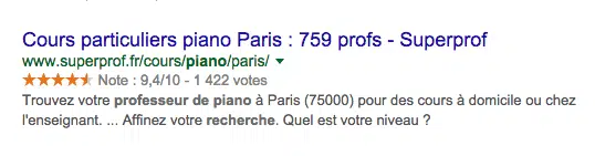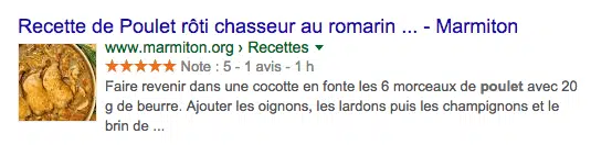 Les éléments qui permettent d’enrichir le code, c’est ce qu’on appelle les micro-données, aussi appelées « données structurées ». Ce terme vous est peut-être déjà familier si vous utilisez les « rich snippets ». Les rich snippets permettent d’enrichir les extraits des pages dans les résultats de recherche (avec des étoiles, un nombre d’avis, des photos, des disponibilités, des temps de préparation, des prix, etc.). Vous connaissez tous de quoi il s’agit, même si vous n’en utilisez pas sur votre site. Ça ressemble à ça :