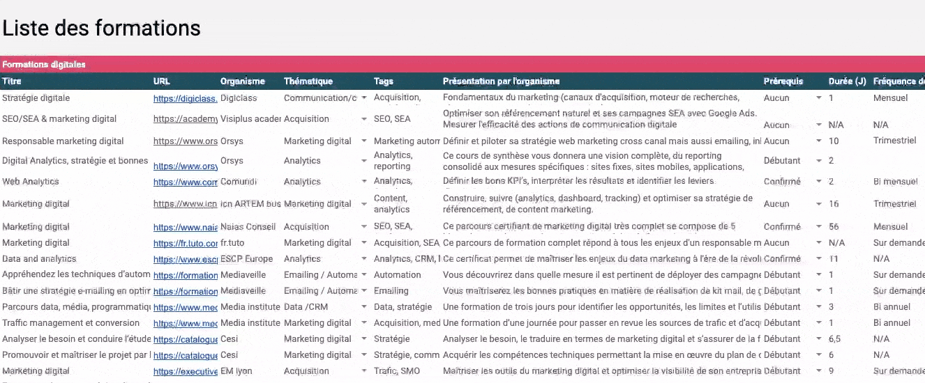 C’est pour ces raisons que nous avons constitué pour vous un guide répertoriant 77 formations de qualité pour vous permettre de trouver celle qui vous correspond, que vous soyez débutant ou confirmé. Pour chaque formation, nous avons réuni les informations clés : le thème de la formation, l’organisme, le prix, la prise en charge ou non par le CPF, la délivrance ou non d’une certification et la durée de la formation. Ce guide GSheets est entièrement gratuit. Nous vous invitons à le télécharger en cliquant sur le bouton sous le GIF.
