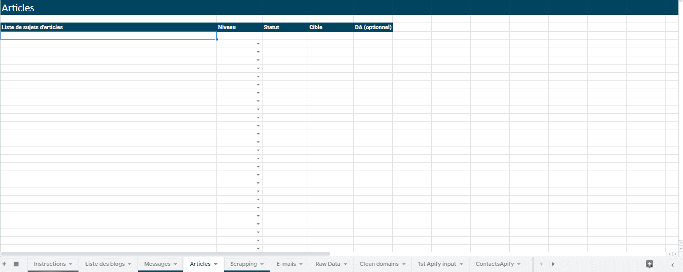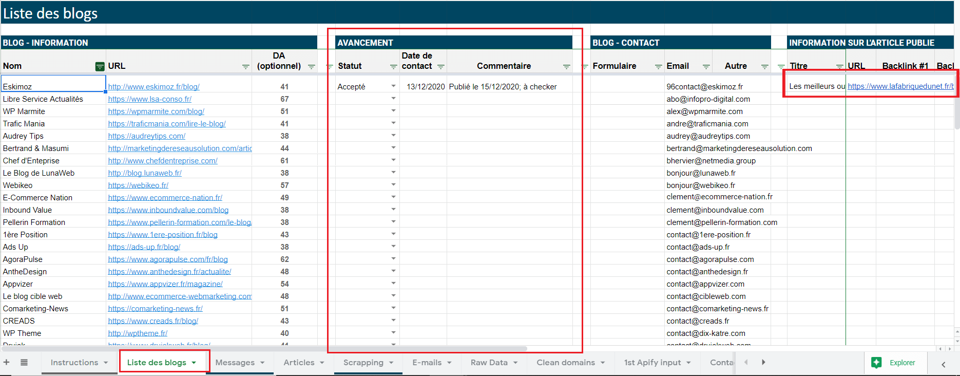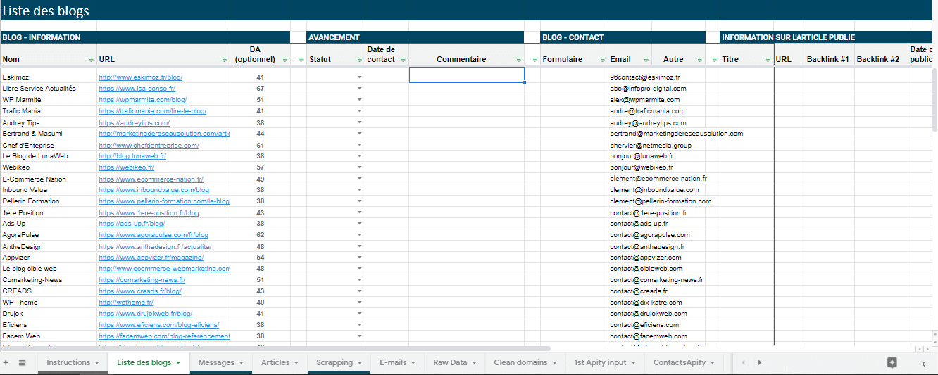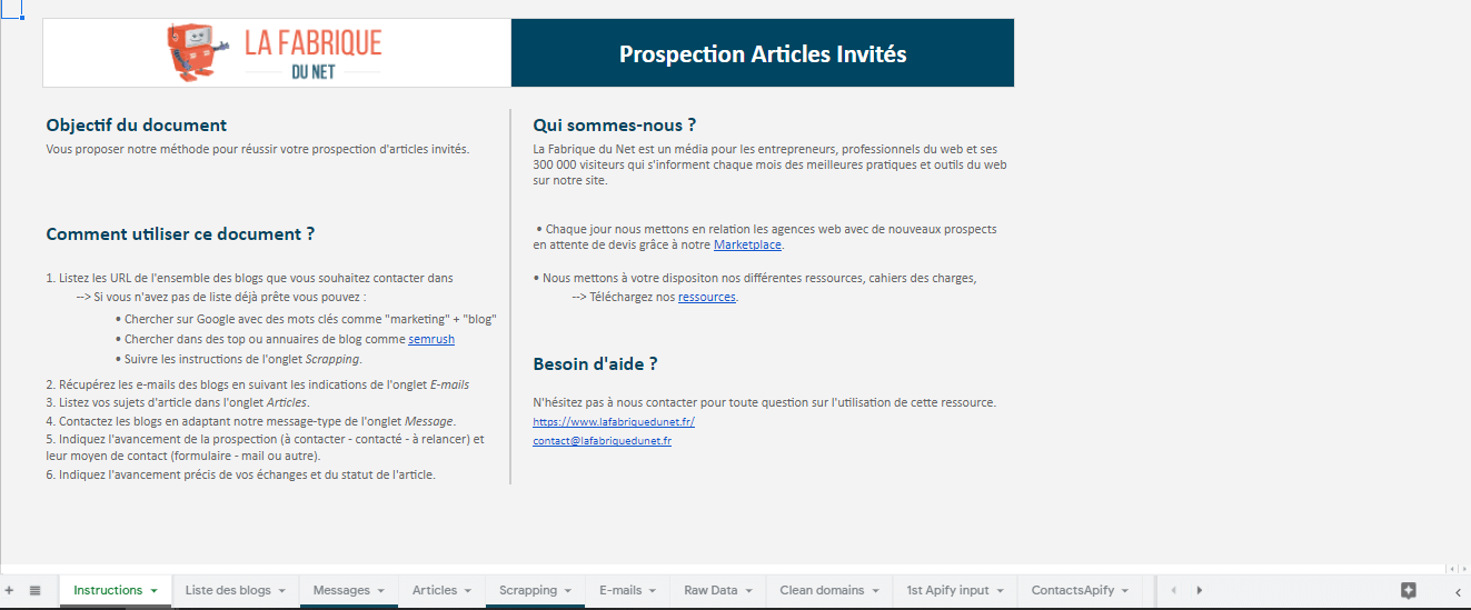 Bien sûr, cette démarche part du principe que vous disposez déjà d’une liste de blogs pertinents où publier vos articles invités. Si tel n’est pas le cas, vous devez vous demander comment faire. Encore une fois, pas de panique, nous ne vous avons pas oublié ! Nous vous proposons de « scrapper » Google pour générer une liste rapidement. La démarche est détaillée étape par étape dans l’onglet « Scrapping » de notre ressource. Cette démarche consiste à automatiser l’identification des blogs qui correspondent à votre thématique, puis à automatiser la collection des informations importantes chaque blog. Vous allez gagner un temps considérable au lieu d’aller glaner ces informations une par une sur chacun de ces sites.