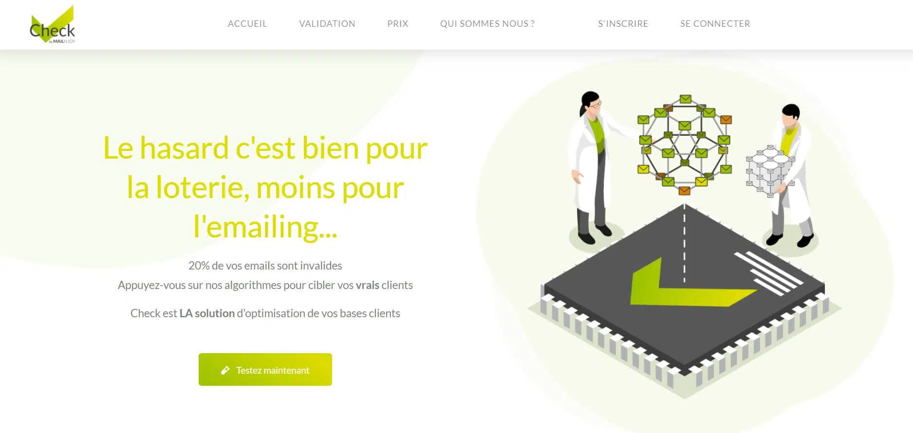 Mailnjoy est une entreprise exclusivement française qui propose un outil intuitif et à la technique poussée permettant d’obtenir des résultats fiables et détaillés pour répondre aux besoins emailing actuels. L’outil de vérification des emails Check® est une plateforme Saas qui propose plusieurs modes : validations unitaires simples, approfondies, validations de listes… et va au-delà de la simple validation en déterminant la valeur commerciale d’une adresse mail.