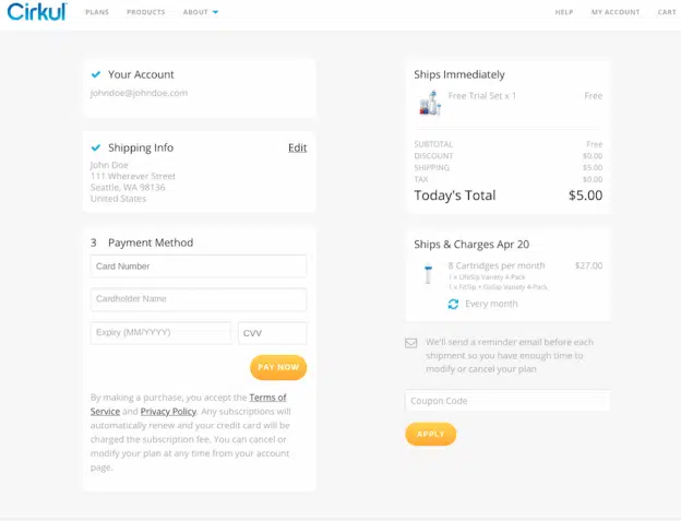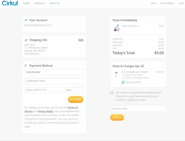 Les pages propres et bien faites ainsi que les formulaires simples sont une excellente manière d’éviter la friction – c’est pourquoi nous aimons bien cet exemple de page de paiement. Son design moderne et attractif combine parfaitement les informations de livraison et de paiement qui sont présentes sur une seule page. En ce qui concerne les informations de paiement, Cirkul va droit à l’essentiel : nom, numéro de carte, date d’expiration et code de sécurité (CVV / CVC). Toutefois, de plus en plus de sites proposent également des options de paiement alternatives (portefeuilles numériques, paiement fractionné, etc.) directement intégrées pour simplifier davantage l’expérience utilisateur. Ce look épuré reste une référence, mais l’ajout de méthodes de paiement modernes tend à devenir la norme. C’est ce qui explique pourquoi les formulaires de Cirkul se convertissent si bien. Pourquoi nous l’aimons bien : parce qu’il est propre et que vous ne trouverez pas plus simple.