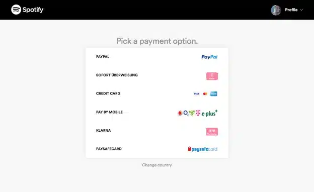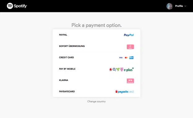 Mis à part le fait que cette page de paiement demande le strict minimum d’information (que nous avons déjà identifié comme une bonne chose), Spotify s’assure que les clients peuvent payer en utilisant n’importe quelle méthode. En sélectionnant un pays, vous aurez accès à de nombreuses options de paiement du pays en question (celles présentées dans l’image ci-dessus sont destinées aux clients allemands). Et, comme la page de paiement adapte automatiquement les prix et méthodes de paiement selon la localisation de l’utilisateur, il n’est pas nécessaire de faire des conversions de devises ou de chercher des options adaptées. Clairement, Spotify travaille dur pour satisfaire les clients dans toutes les parties du monde – et cela à l’air de très bien fonctionner. Pourquoi nous l’aimons : il offre plusieurs méthodes de paiement.