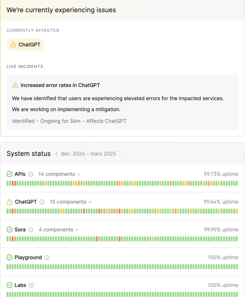 - Les autres services OpenAI fonctionnent : API, Labs, Playground ou Sora restent disponibles, avec des taux de disponibilité supérieurs à 99,8 %.