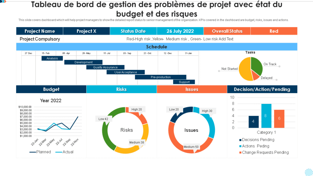 Le projet est lancé, mais sans indicateurs, pas de pilotage. On parle ici de KPI opérationnels : % d’avancement, écarts de délais, budget consommé, charge réelle vs prévue… Suivre entre 5 et 10 indicateurs est recommandé. Pour ça, on s’appuie sur un tableau de bord projet, bien construit et mis à jour régulièrement.