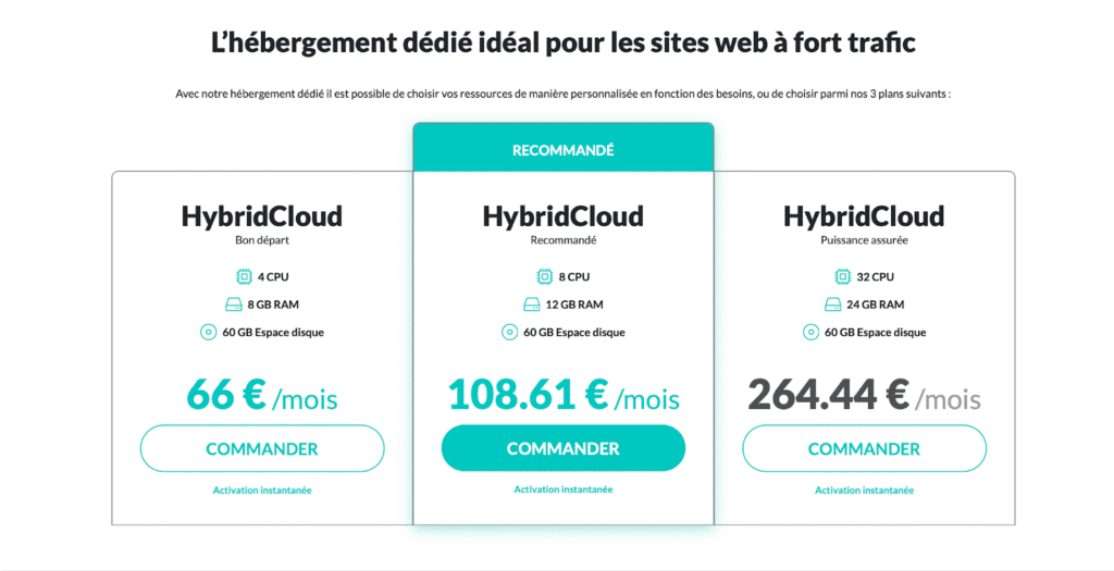PlanetHoster propose trois configurations prédéfinies pour son offre HybridCloud, à partir de 66 €/mois. Chacune inclut 60 Go de stockage (extensible) et varie surtout en puissance de calcul (CPU/RAM). La formule intermédiaire à 108,61 €est clairement positionnée comme l’option recommandée pour des sites à fort trafic ou en croissance continue.