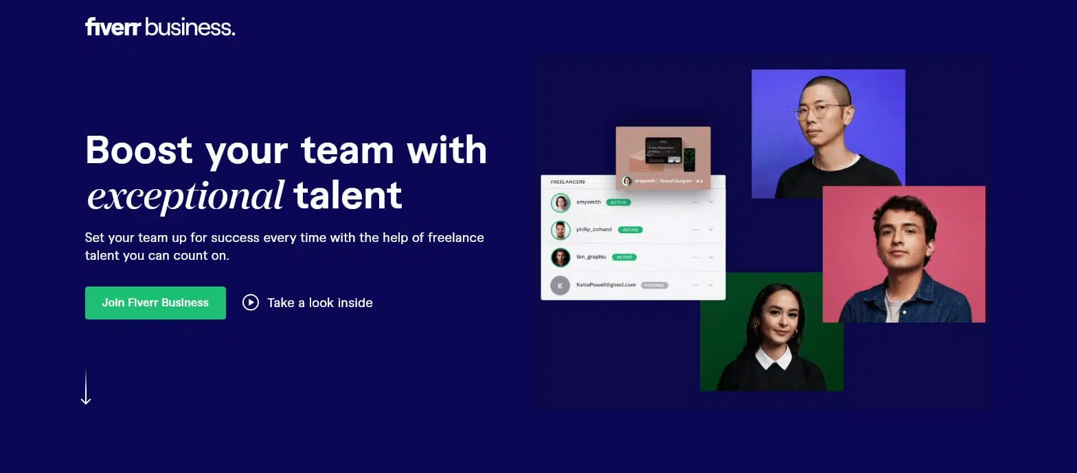 Avec Fiverr Business, vous pouvez confier votre recherche de freelances à un success manager dédié qui se chargera de vous accompagner pour constituer une équipe de freelances prêts à réaliser votre projet. Vous avez accès à un catalogue de freelances présélectionnés en fonction de vos besoins. Il s’agit d’une solution complète qui vous permet de faciliter la collaboration avec les freelances en charge de votre projet.