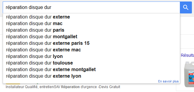 Propositions de saisie automatique pour le mot-clé « réparation disque dur » :