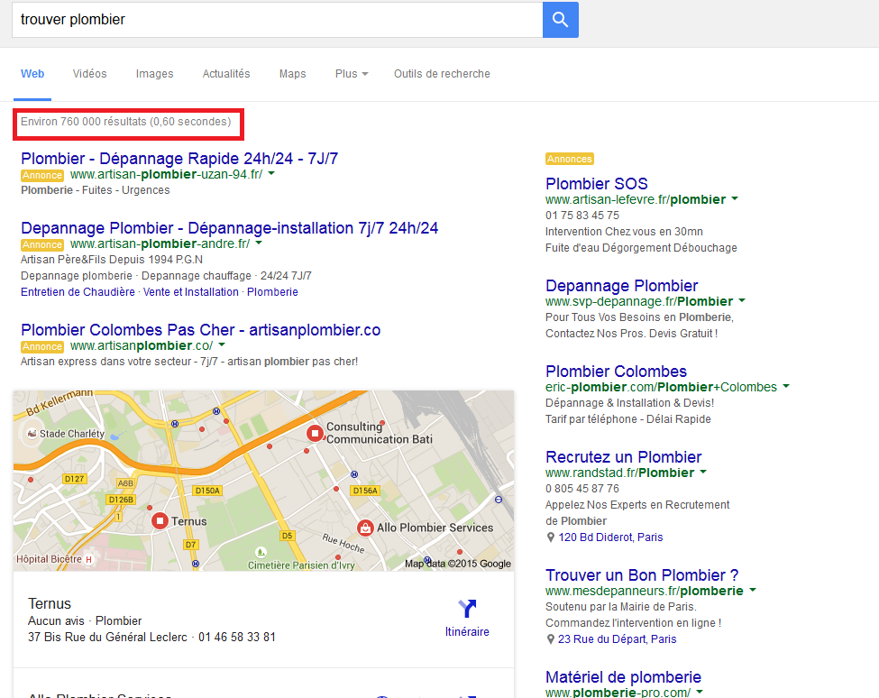 Pour cette requête, Google propose 760 000 résultats, ce qui est beaucoup. Comme sur toutes les requêtes concurrentielles, le référencement payant prend les premières places dans les résultats (liens sponsorisés en haut et à droite de la page qui masquent sur l’écran les résultats naturels). Pour apparaître dans le bloc local (Google Business Profile, relié à Google Maps), lire notre article consacré au référencement local.