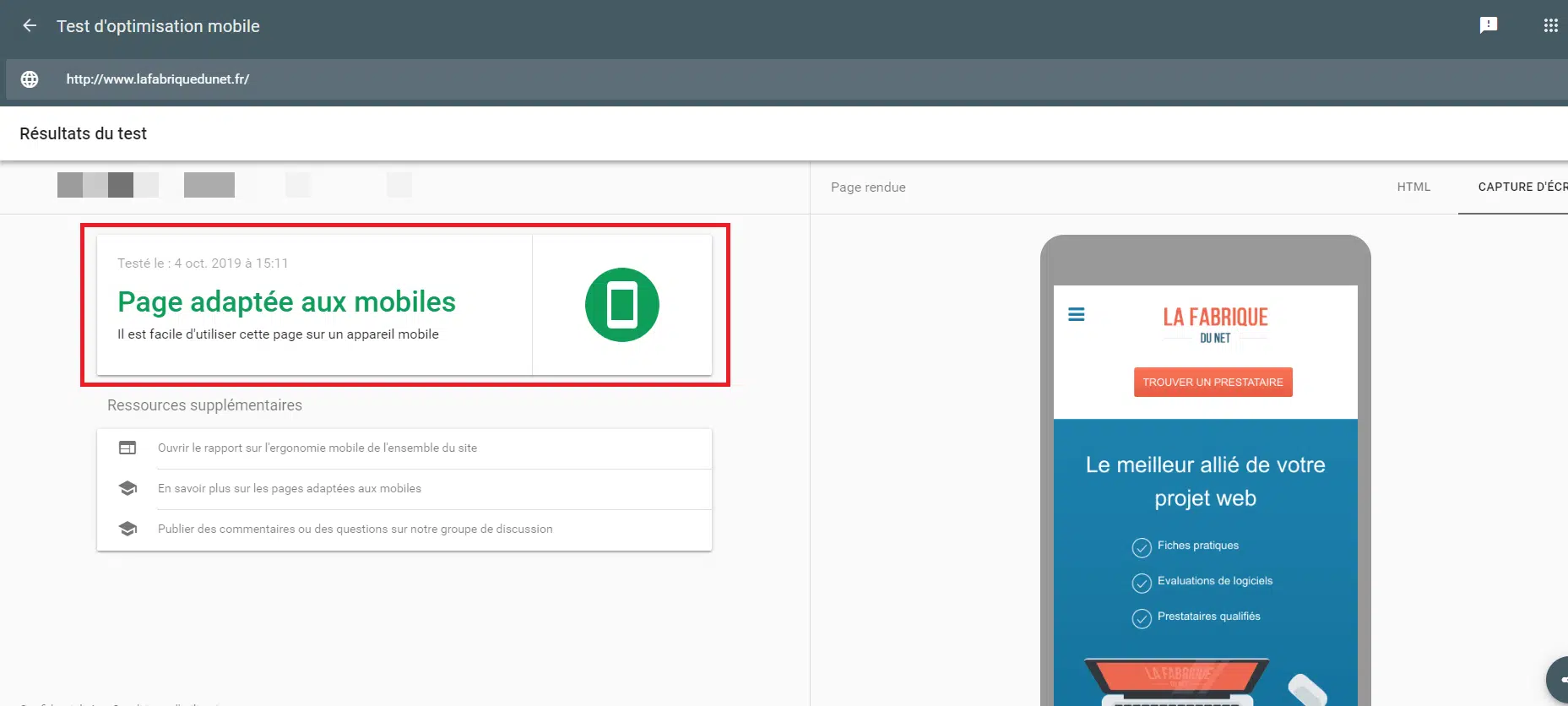 Une fois que vous avez renseigné l’URL de votre site web (ou de votre page web si vous voulez tester l’affichage d’une page en particulier de votre site), Google se met au travail et vous indique si votre site répond bien aux critères de la mobile-friendlité. Nous avons fait le test et avons l’honneur de vous annoncer que La Fabrique du Net est quasiment (cf. la zone pixelisée) parfaitement mobile-friendly :