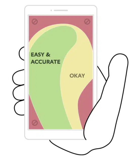 75% des utilisateurs naviguent sur leur mobile avec leur pouce. Évitez d’intégrer des boutons dans les angles et tout en haut de l’écran : ce sont les endroits les moins accessibles pour le pouce. Quelle que soit la taille du téléphone, les éléments doivent idéalement être placés vers le milieu de l’écran.