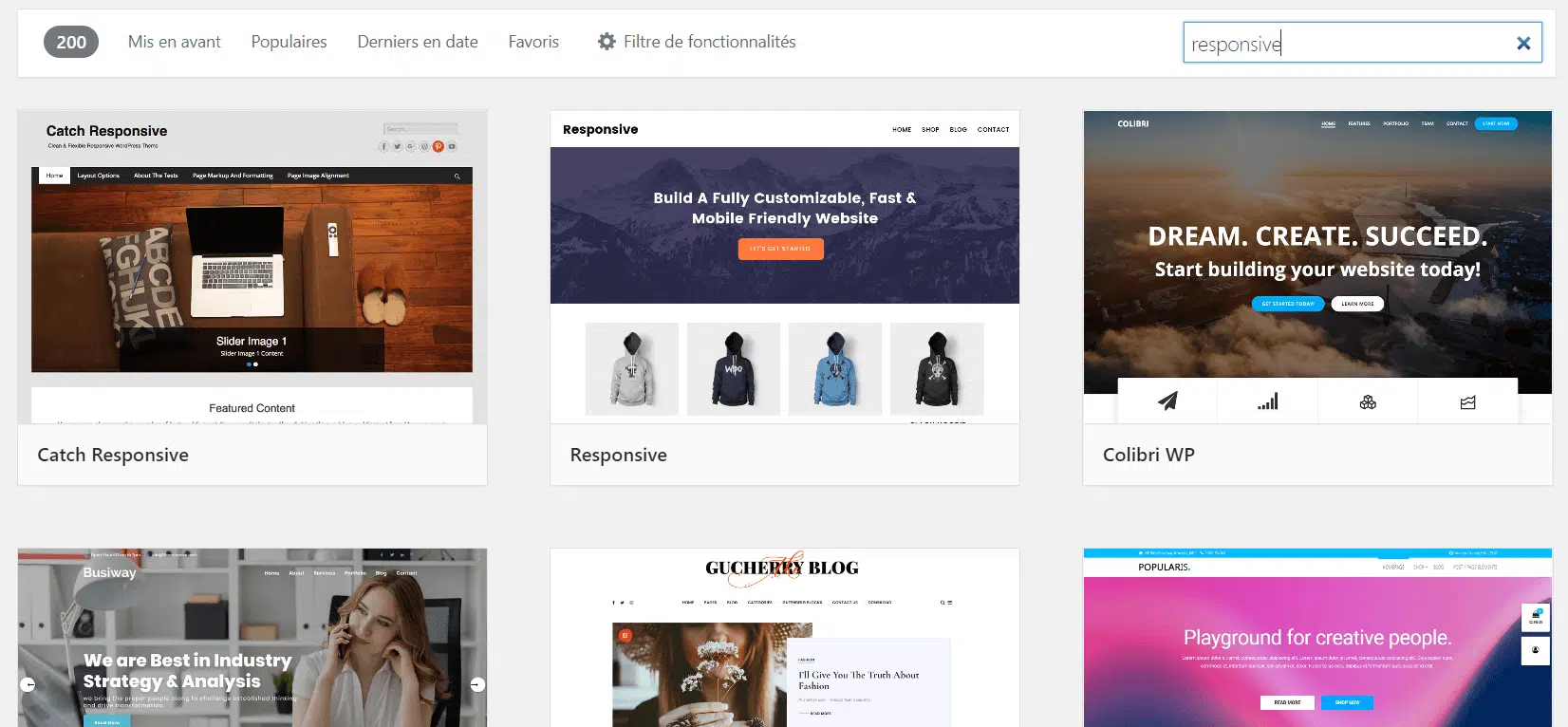 Si vous avez un site web pas du tout adapté pour le mobile et que vous voulez y remédier rapidement, la meilleure solution est sans doute de changer complètement votre thème graphique. Si vous avez un site déjà bien installé, qui tourne bien, ce n’est peut-être pas la meilleure option. Mais si vous avez un faible trafic ou que vous vous lancez (a fortiori), installer un thème responsive est la meilleure chose que vous ayez à faire. Si vous utilisez WordPress, changer de thème est très simple. Il suffit d’aller dans Apparences > Thèmes et d’activer un nouveau thème. Vous pouvez taper « responsive » dans la barre de recherche pour trouver un thème responsive.