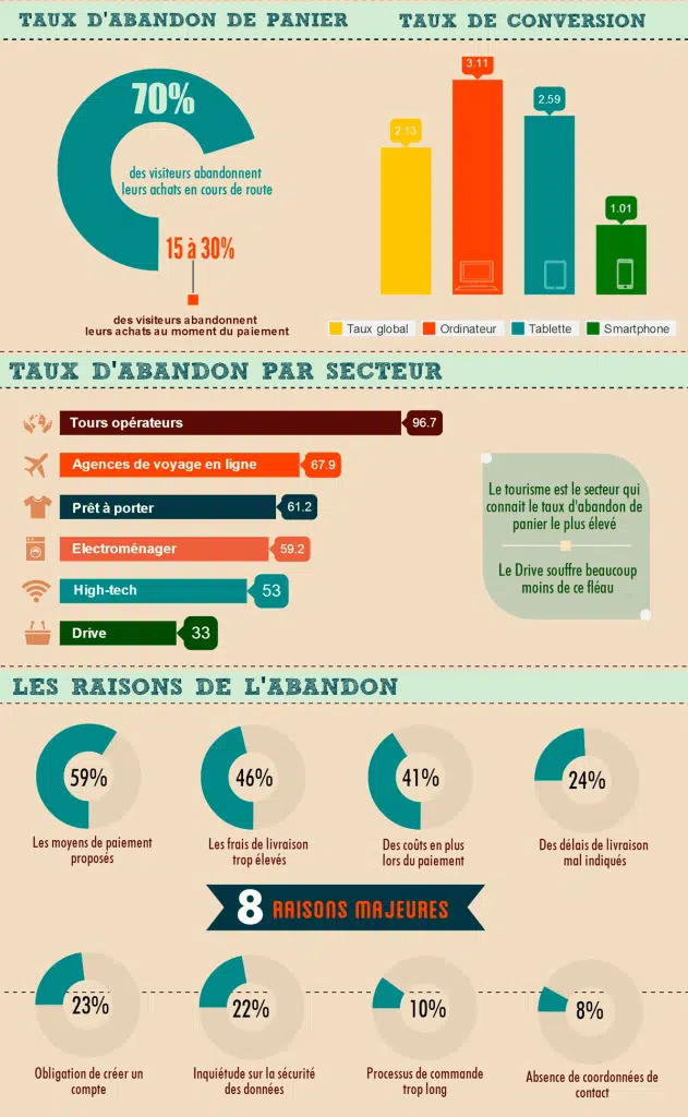 La relance de panier abandonné est une technique qui permet de relancer les personnes qui ont abandonné leur commande avant le paiement. L’objectif ultime est donc d’améliorer le taux de conversion de votre boutique en ligne. Évidemment, qui dit fort abandon de panier dit faible taux de conversion. Le taux de conversion, rappelons-le, est le pourcentage d’internautes (de visiteurs) qui se rendent sur votre site mais ne convertissent pas. En l’occurrence, puisque l’on parle de ecommerce : qui n’achètent pas. Les dernières études montrent que l’écart entre l’abandon de panier sur mobile et sur ordinateur s’est réduit en 2025, grâce à l’amélioration des parcours d’achat mobile et à la généralisation des solutions de paiement rapide (Apple Pay, Google Pay). Désormais, plus de 55% des achats en ligne sont finalisés sur mobile. Par ailleurs, les relances par SMS et notifications push sont devenues aussi efficaces que l’email, notamment auprès des moins de 35 ans. Le taux d’abandon de panier est très élevé dans le secteur du tourisme, toujours d’après l’infographie mentionnée plus haut et présentée ci-dessous (version partielle). On pourrait apporter plusieurs explications à ce phénomène, la principale étant surement liée à la taille du panier. Un voyage coûte plus cher qu’une chemise : l’internaute y réfléchit à deux fois avant de finaliser sa commande. Il visite aussi plus de sites, pour obtenir le meilleur prix, etc.