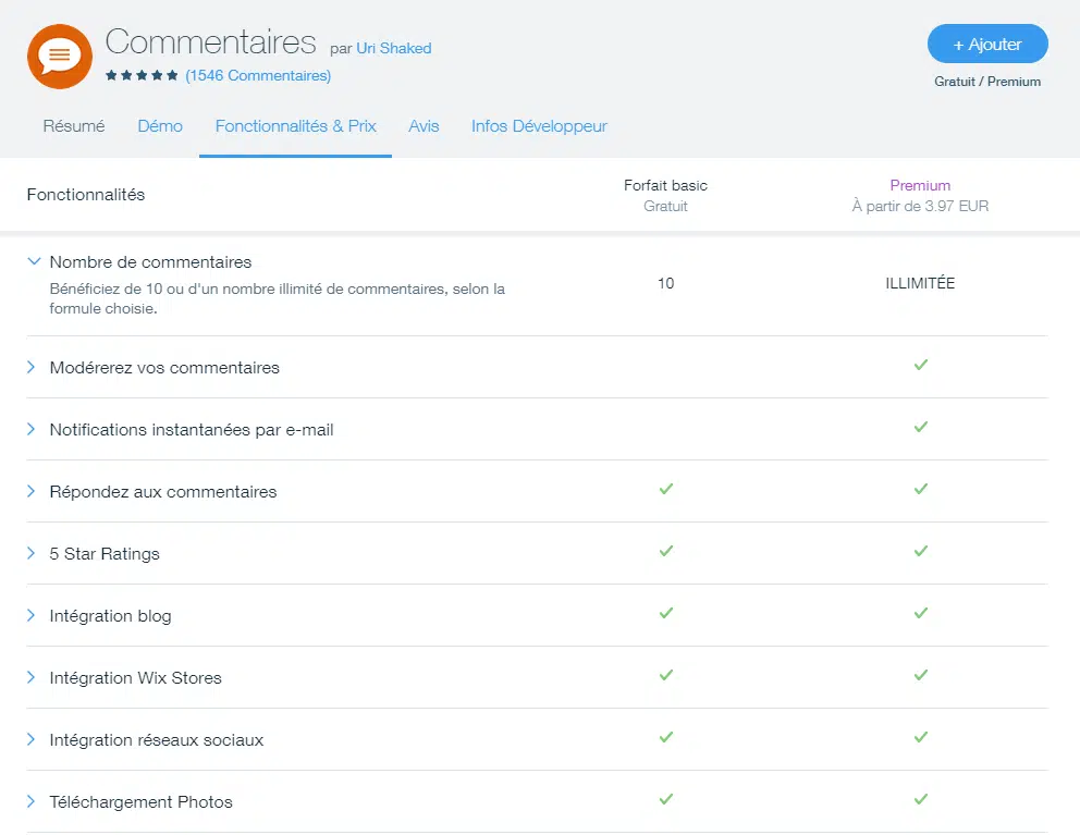 Le Wix App Market compte plus de 1 000 applications. Beaucoup sont gratuites, certaines fonctionnent en freemium (chat en direct, avis clients, automatisation marketing).