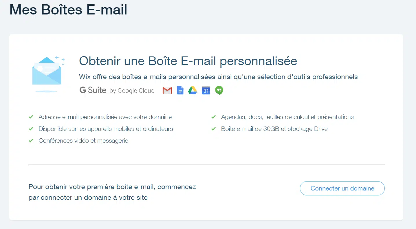 Les forfaits Premium ne comprennent pas directement d’e-mail personnalisé, mais Wix propose un partenariat avec Google Workspace et Microsoft 365. Vous pouvez ainsi créer facilement des adresses professionnelles à partir de 6 €/mois/utilisateur.