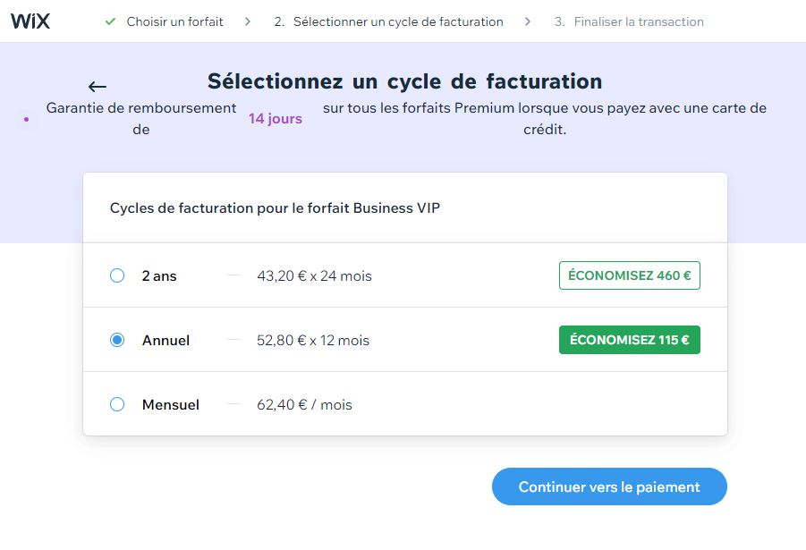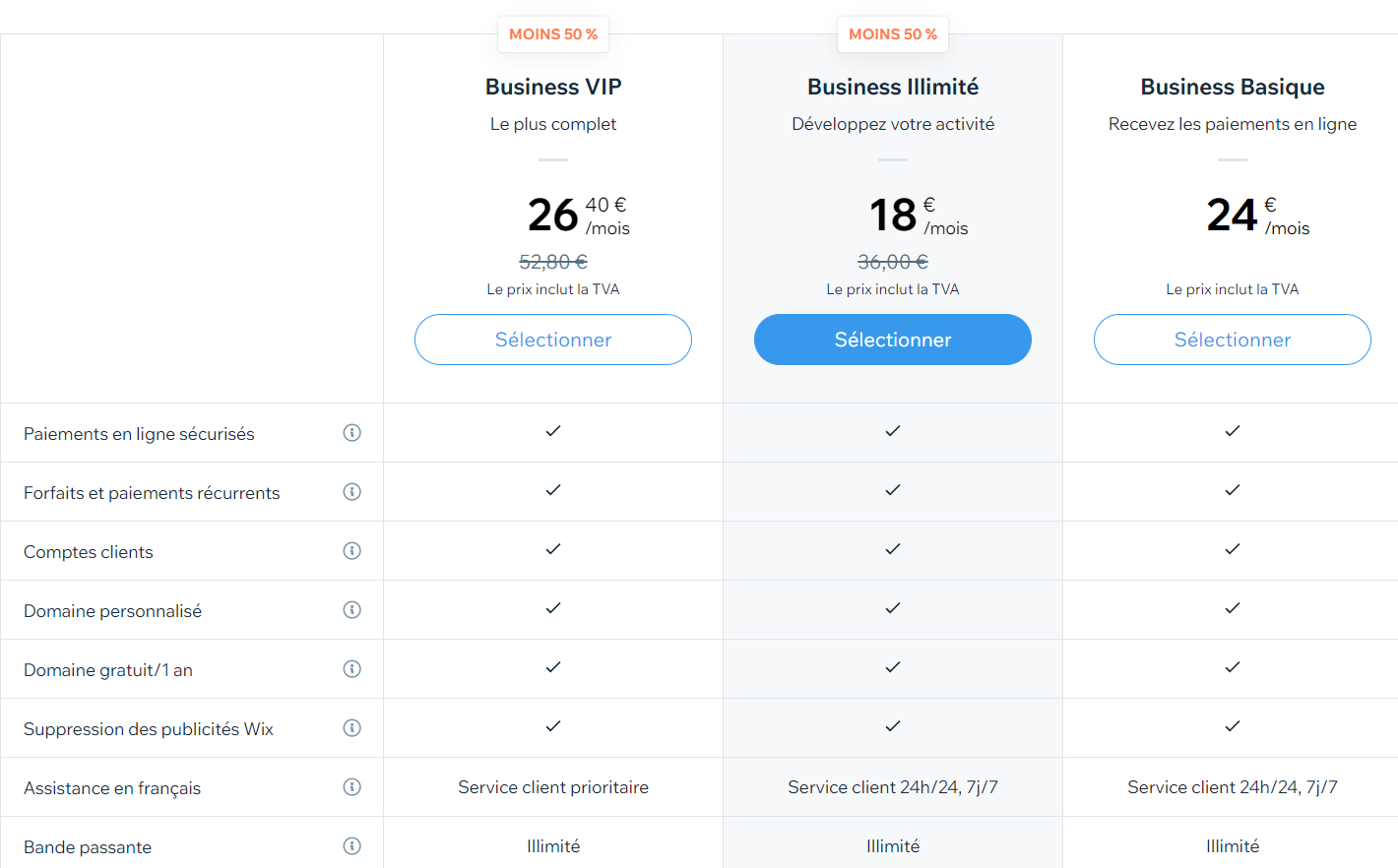 Tous les forfaits Premium Wix incluent un domaine gratuit la 1ʳᵉ année. Ensuite, il faut le renouveler, pour un coût standard compris entre 14 € et 30 €/an selon l’extension (.fr, .com, etc.).