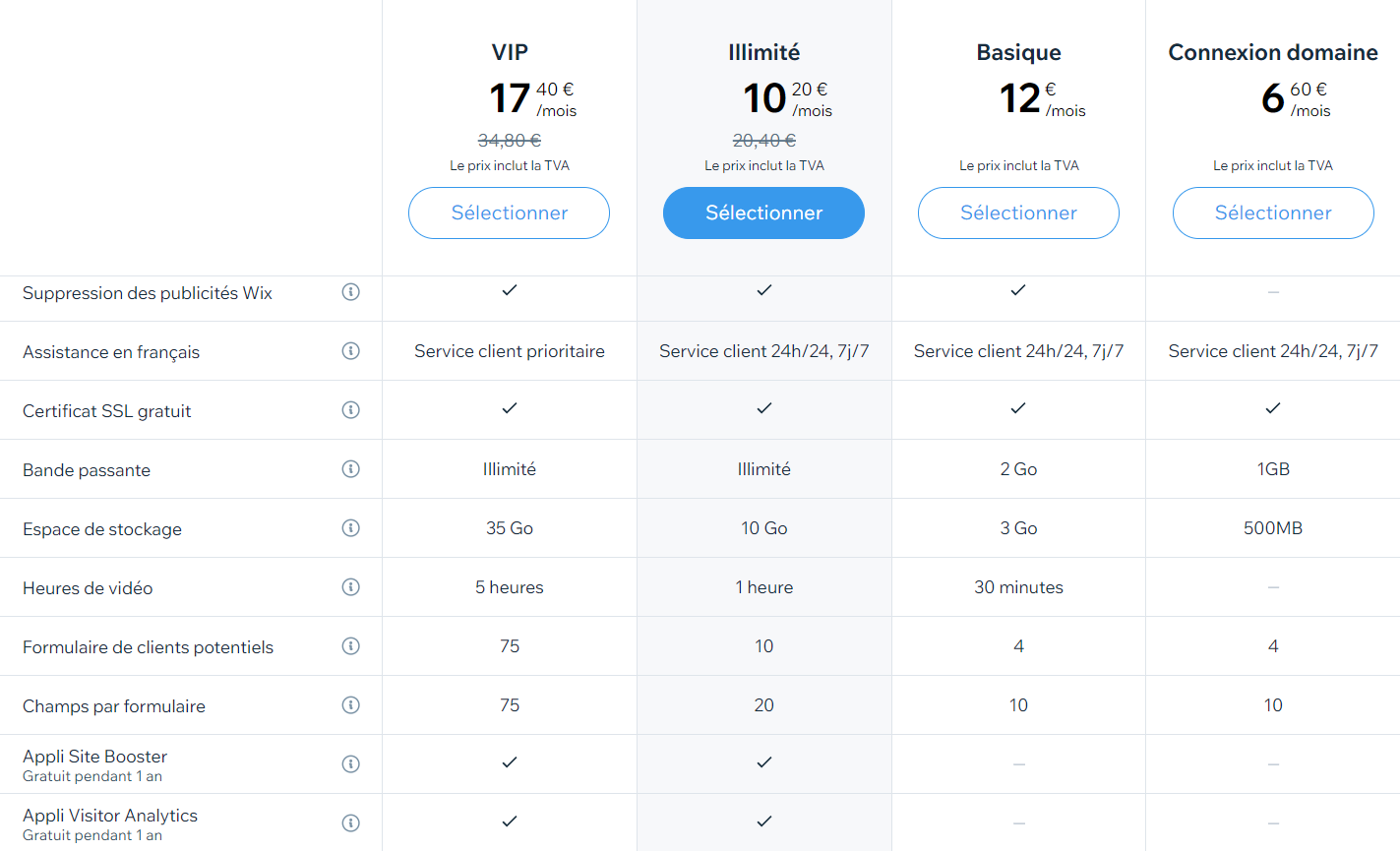 | Offre Wix | Prix mensuel (TTC) | Stockage | E-commerce | Pour qui ? |