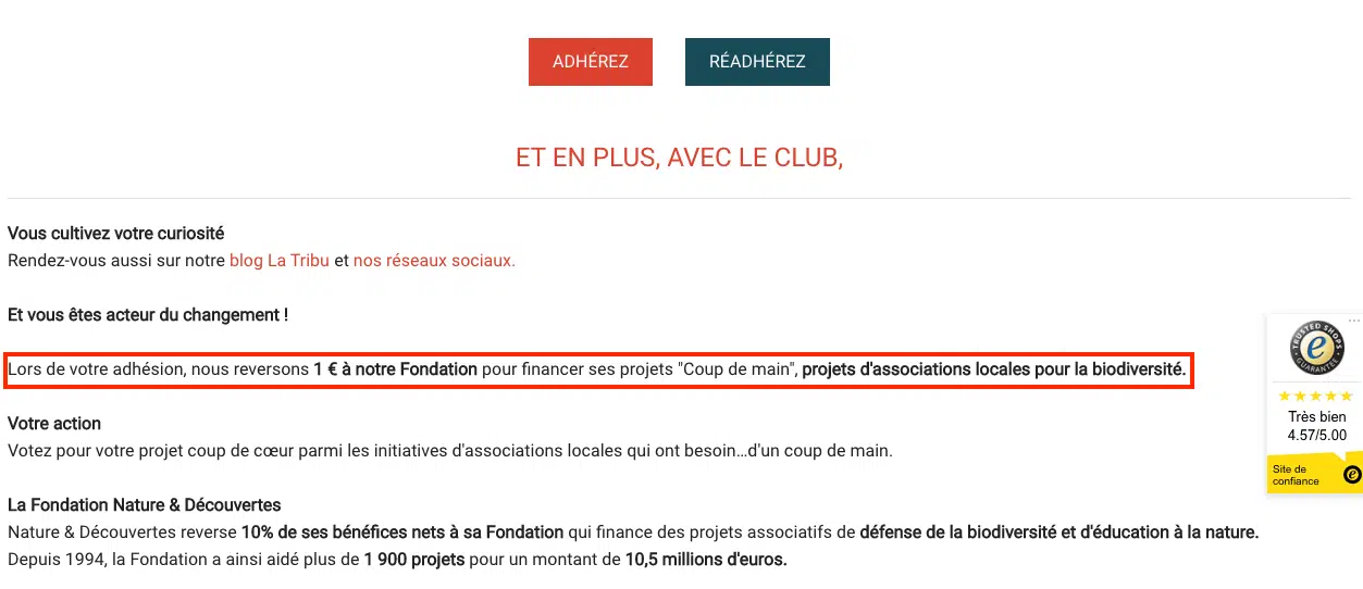 Nature et Découvertes intègre cette approche dans son programme de fidélité à points. La marque reverse 1 euro à sa fondation à chaque inscription au programme de fidélité.