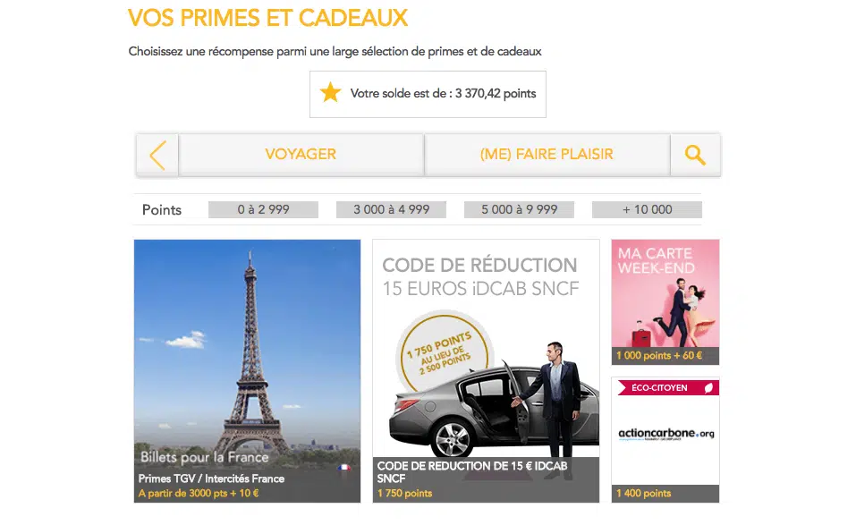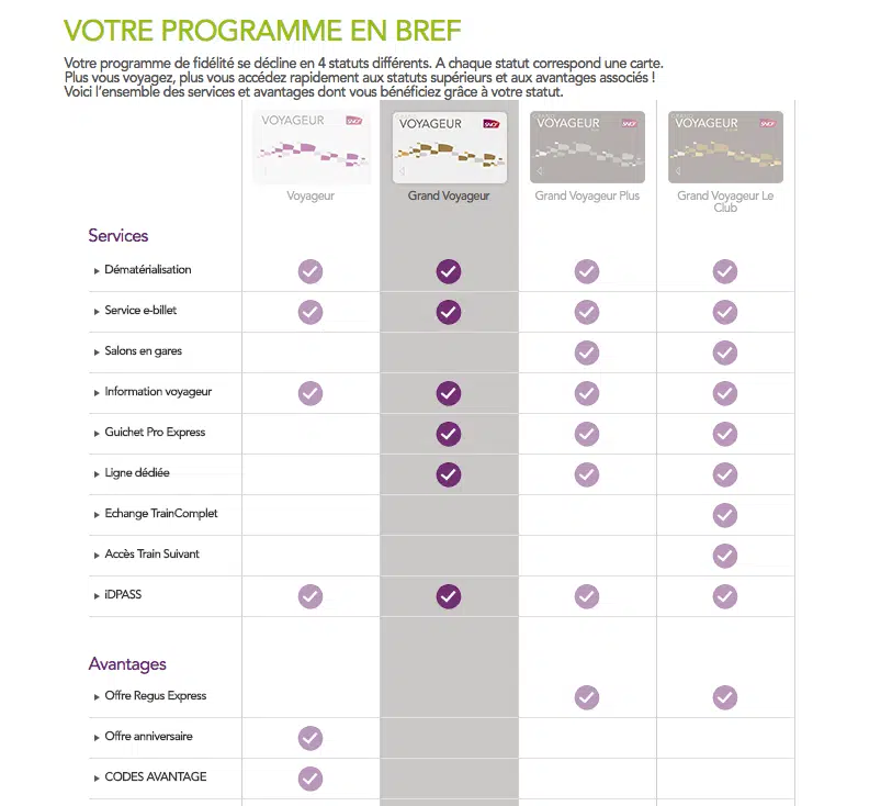 Les programmes de fidélité évolutifs sont très simples à concevoir et adaptés à presque tous les business. Le principe, en soi, est très simple : plus un client achète, plus il doit recevoir en retour de la part de l’entreprise. Les programmes sont déclinés en statuts. Le passage d’un statut à l’autre dépend du montant des achats réalisés par le client. Le passage à un statut supérieur confère de nouveaux avantages, plus de réductions, etc. Ces avantages ne sont pas forcément financiers. Ils peuvent prendre la forme d’invitations à un événement, de mise à disposition de contenus exclusifs, etc. SCNF propose un programme de fidélité évolutif, décliné en statuts : Voyageur, Grand Voyageur, Grand Voyageur Plus, Grand Voyageur Le Club
