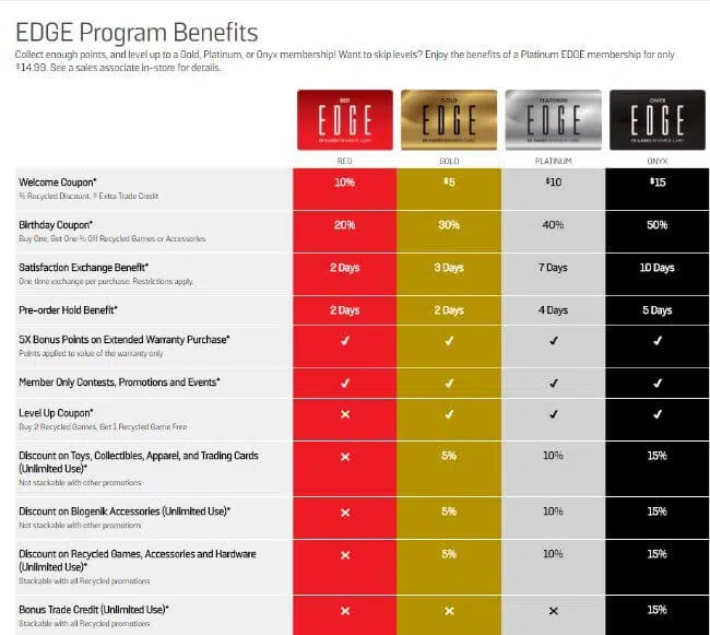 Ces programmes jouent sur l’amour-propre des clients, qui aiment, comme tout le monde, se sentir appartenir à un groupe privilégié et pouvoir accéder à des avantages exclusifs. C’est l’une des raisons du succès de ces programmes de fidélité et de leur adoption par les plus grands groupes. Ce genre de programme est très fréquent dans les secteurs d’activité du Travel et du Divertissement, mais on le retrouve dans bien d’autres secteurs. Voici un autre exemple, celui du programme EDGE proposé par le distributeur de jeux vidéo EB Games :