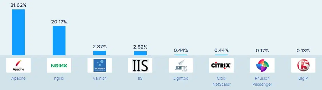 - Apache recule mais reste solide avec 15,3 %. Ancien, mais encore massivement utilisé dans les hébergements mutualisés.