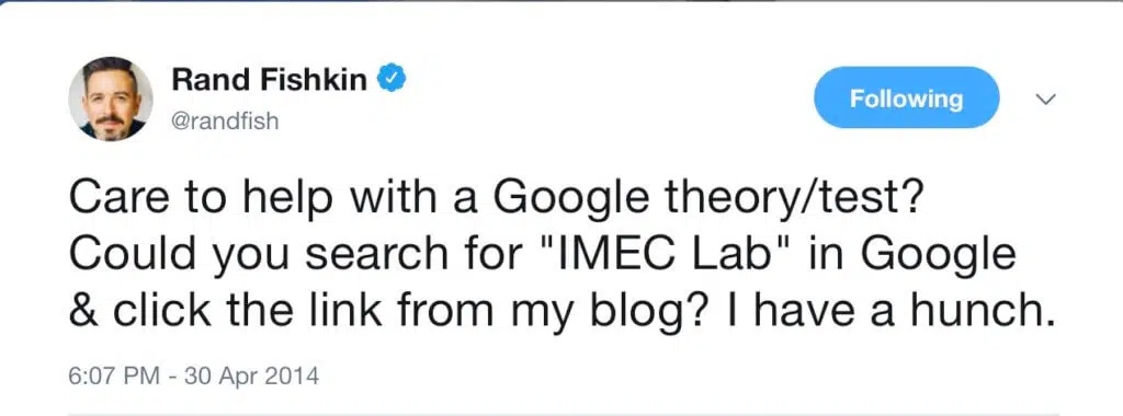 Par exemple, Rand Fishkin, le créateur de Moz, a mené une expérience pour montrer à quel point le CTR est important pour décider du classement de votre site web. Il a donc demandé à son auditoire de rechercher un mot clé (le laboratoire IMEC) sur Google et de cliquer sur le résultat de recherche mentionné. Voici le tweet qu’il a envoyé :