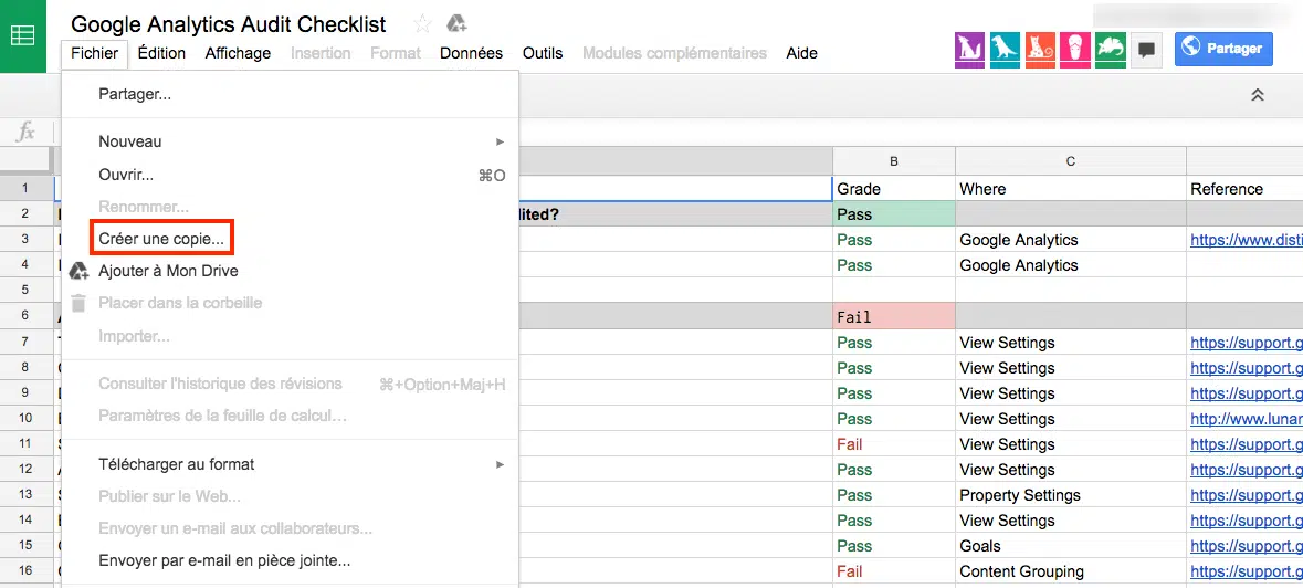 Pour être utile, l’audit de votre compte Google Analytics doit être facilement accessible aux collaborateurs de l’entreprise. Raison pour laquelle nous vous conseillons de créer un document Google Sheet, partageable sur le drive en mode collaboratif. Le site internet Distilled propose un modèle de document très bien conçu et téléchargeable gratuitement à cette adresse. Pour pouvoir l’utiliser, vous devez en créer une copie.
