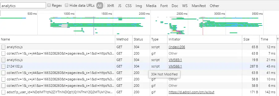 Avant même de commencer l’audit, vous devez vérifier que Google Analytics fonctionne bien et identifier la version de Google Analytics utilisée pour votre site web. Pour vérifier que GA est bien installé, nous vous conseillons d’utiliser Chrome DevTools. Une fois sur l’interface de l’outil, cliquez sur « Network » dans le menu en haut de la page, rafraîchissez la page et tapez « analytics » dans le moteur de recherche. Vous verrez quelque comme ça :