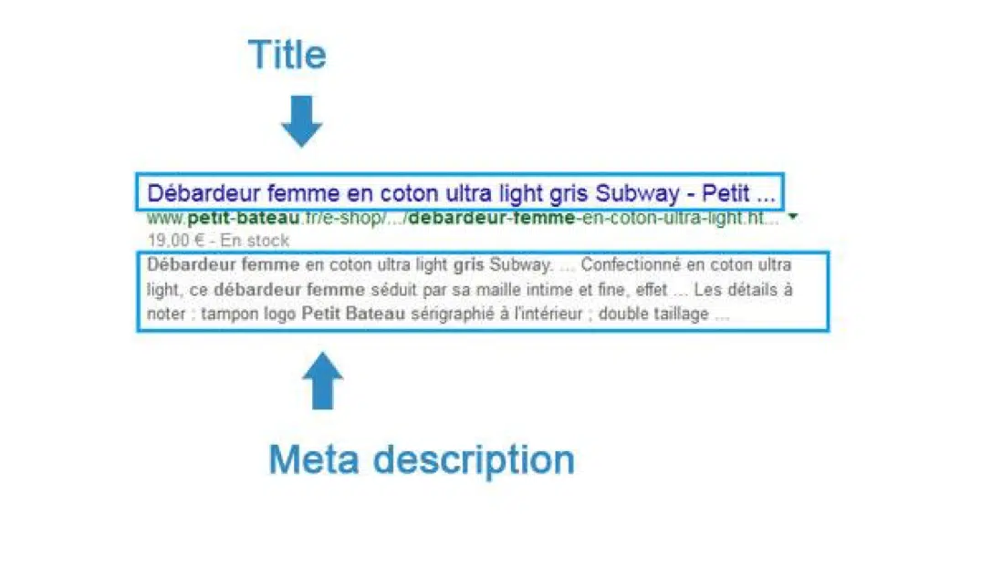 Chaque page de votre site web doit avoir une balise Meta Description et une balise Title unique. La balise Title, c’est le titre de votre page tel qu’il apparaît dans les résultats de recherche. La balise Meta correspond à la description de la page située sous le titre (toujours dans les résultats de recherche).