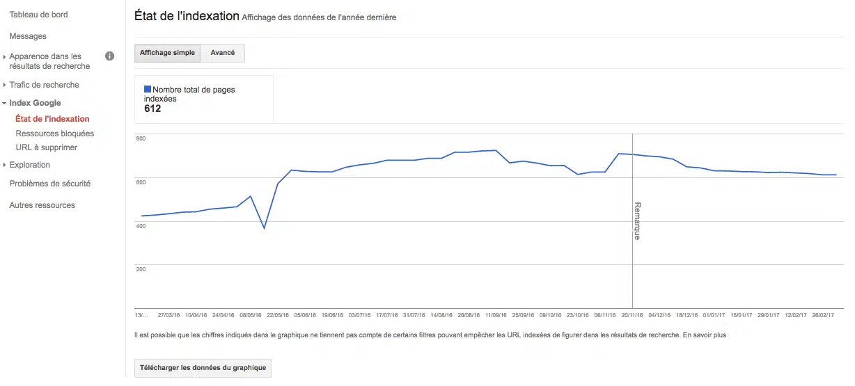 - Toujours sur Google Search Console, vérifiez l’index de votre site web, c’est-à-dire le nombre de pages web indexé dans le moteur de recherche. Si vous constatez un changement brutal du nombre de pages indexées, c’est qu’il y a surement un problème quelque part. Comparez le nombre de pages indexé avec le nombre total de pages que contient votre site web : cela vous permettra de savoir si votre site est globalement bien indexé par Google…ou pas. Si l’écart est de l’ordre de 20%, il n’y a pas trop d’inquiétude à se faire. En revanche, si l’écart va du simple au double, ou du simple au triple, vous devez chercher à comprendre pourquoi.