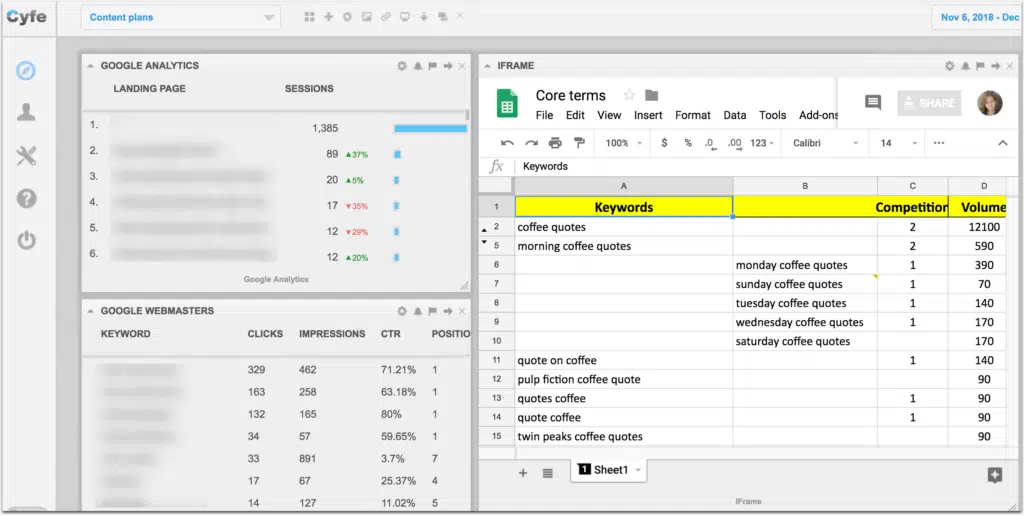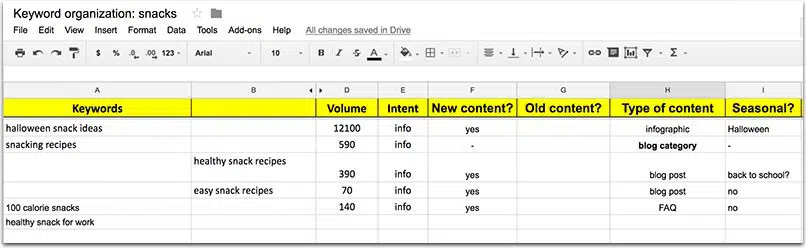 Une fois que vous avez identifié les groupes de mots-clés choisis (la plupart de ces groupes peuvent être inclus dans un élément de contenu), utilisez-les dans Google Sheets ou des outils de gestion de projet collaboratifs comme Notion ou Airtable pour planifier votre stratégie de contenu. Mettez vos mots clés (et groupes de mots clés), un par un, et utilisez toutes sortes d’étiquettes pour définir vos actions futures :