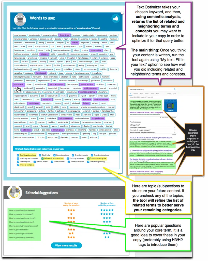 - Questions populaires (idéales pour créer du contenu autour d’elles). En fait, cette FAQ de recherche sur les mots clés a été créée à l’aide des «idées de sujets» et des «suggestions de rédaction» de Text Optimizer.