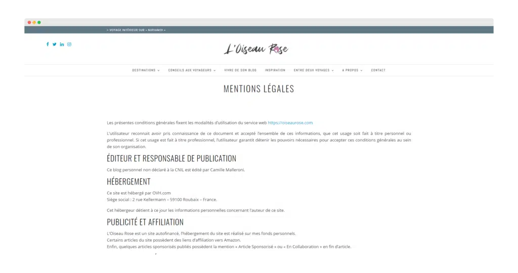 Voici l’un des blogs les plus populaires sur le thème du voyage, l’Oiseau Rose. Ce « blog personnel non déclaré à la CNIL » dispose de mentions légales complètes pour un site non-professionnel.