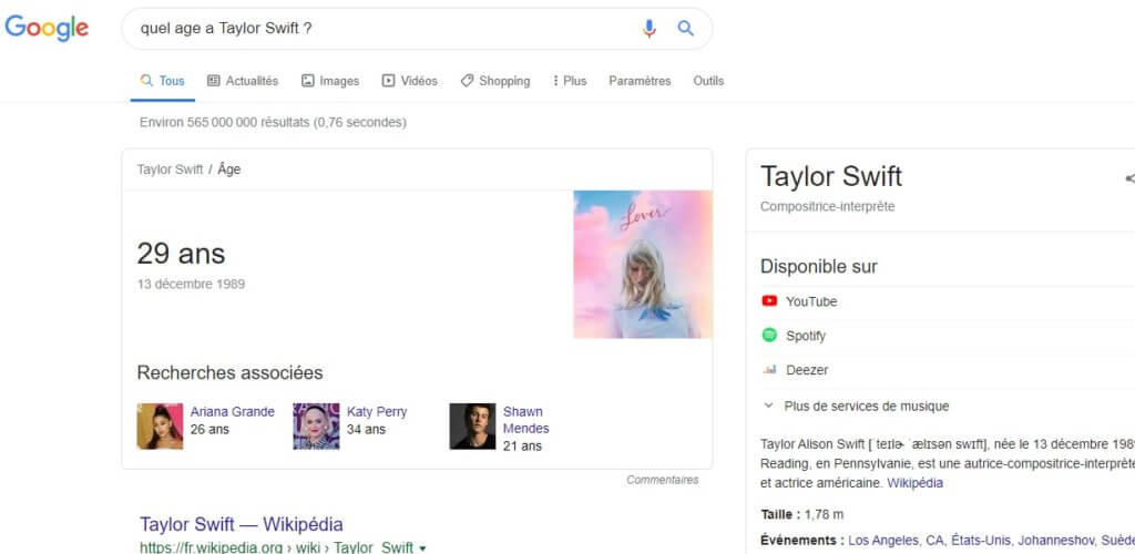 Ces informations proviennent du forum Doctissimo qui se trouve à la deuxième place des résultats de recherche. Le featured snippet vous donne les 3 premières étapes mais vous oblige à cliquer pour découvrir la suite. Mais, que se passe t-il si je souhaite savoir l’âge de Taylor Swift ?