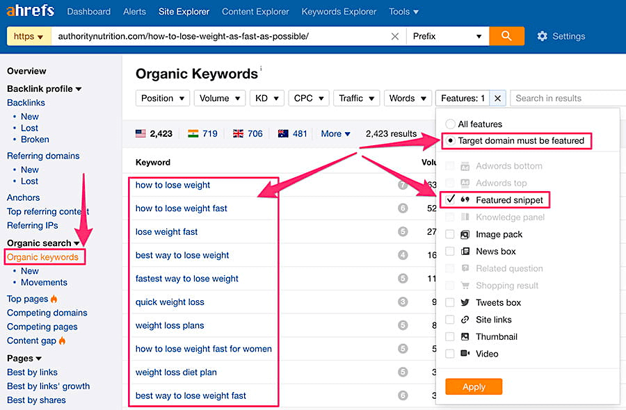 Ce sont de bonnes stratégies à utiliser lors de la création de nouveau contenu, mais c’est aussi une bonne idée de revenir en arrière et d’optimiser l’ancien contenu, en particulier vos éléments les plus populaires. Encore une fois, pensez à la question principale à laquelle chaque article ou post de blog répond, et optimisez-le pour cela. Vous avez peut-être déjà présenté des extraits qui renvoient vers votre site Web sans le savoir. L’outil Ahrefs ’Site Explorer peut vous fournir ces informations sans que vous ayez à rechercher manuellement tous les mots clés que vous avez classés dans Google :