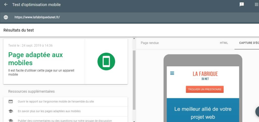 Rappelez-vous que, selon les statistiques un peu plus tôt dans l’article, 31% des utilisateurs de smartphones dans le monde utilisent la technologie vocale au moins une fois par semaine Pensez-vous que Google va leur fournir un résultat qui n’est pas adapté au mobile ? En aucune façon. Vous pouvez vérifier si votre site Web est entièrement optimisé pour mobile avec le test de compatibilité mobile de Google. Voici à quoi ça ressemble :