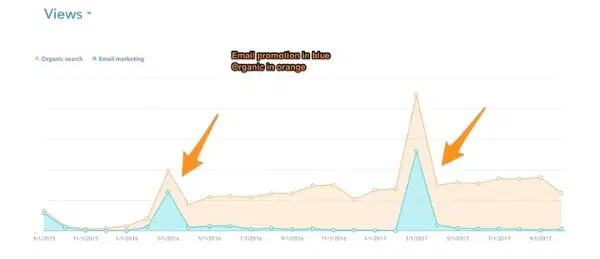 On observe souvent un lien important entre le trafic SEO et le trafic en provenance du canal email. La corrélation est frappante sur le graphique ci-dessous :