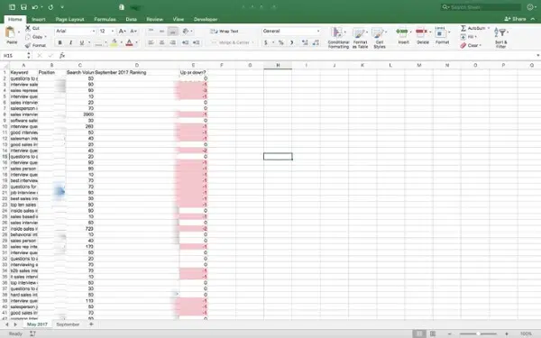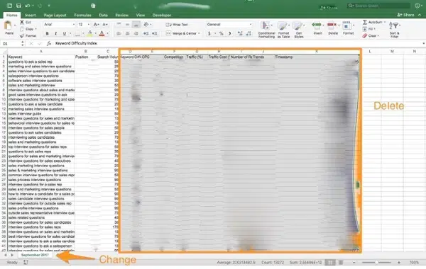 Nous avons la liste des mots-clés (ou plutôt des requêtes) avec, dans la colonne C, le ranking de l’article. Nous revenons ensuite dans SEMRush et sélectionnons cette fois-ci le mois le plus récent – septembre. Nous exportons la liste des requêtes au format CSV et copions-collons le contenu dans un nouveau tableau, sur le même spreadsheet que tout à l’heure. On supprime une nouvelle fois les colonnes de D à K et renommons le tableau“[Most Recent Month] [Year]”, en l’occurrence « Septembre 2017 ».