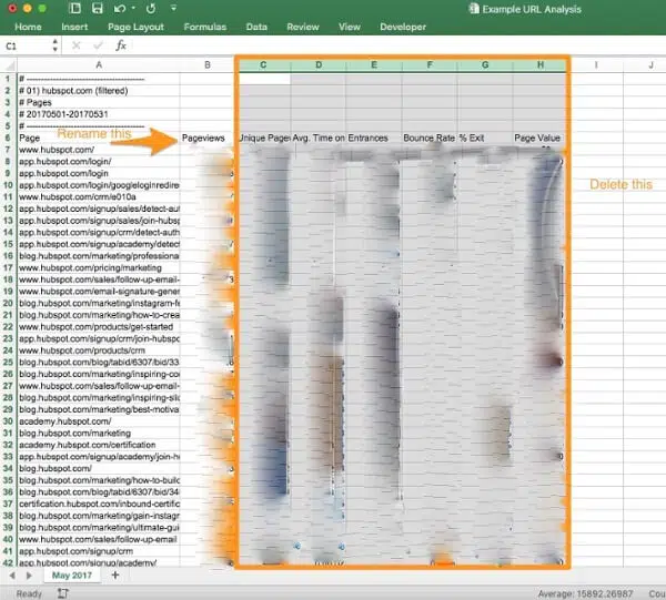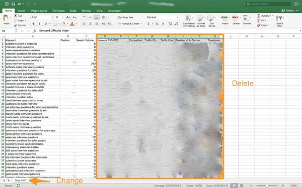 Nous revenons maintenant sur SEMRush et entrons à nouveau l’URL de l’article dans la barre de recherche. Nous modifions la date sous « Live Data », en haut à droite de la page, pour sélectionner le mois qui a généré le meilleur trafic sur l’article. Vous pouvez exporter la liste de mots-clés qui s’affiche au format CSV, sans quitter SEMRush (nous aurons l’occasion d’y revenir). Dans le spreadsheet, nous renommons le tableau [High-Traffic Month] [Year] », en l’occurrence « Mai 2017 ». Nous supprimons les colonnes de D à K.