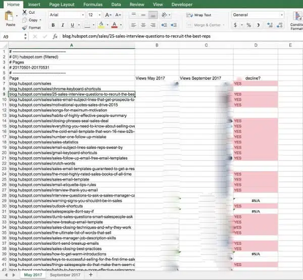 Ce tableau permet d’identifier les mots-clés / requêtes sur lesquels l’article a perdu des positions entre le meilleur mois et le mois le plus récent. Il faut prêter une attention aux requêtes sur lesquelles on est le mieux positionné. On peut constater par exemple que, entre mai et septembre, nous sommes passé du rang 1 au rang 2 sur « sales interview questions » (2 900 requêtes par mois) et du rang 1 au rang 3 sur « inside sales interview questions » (720 requêtes par mois). Ces pertes de positions SEO sont une des raisons de la perte de trafic sur l’article.