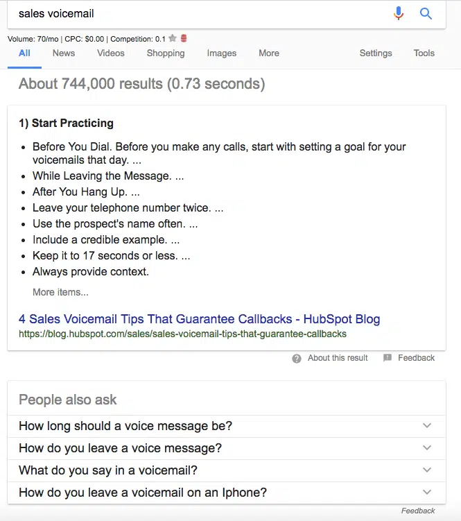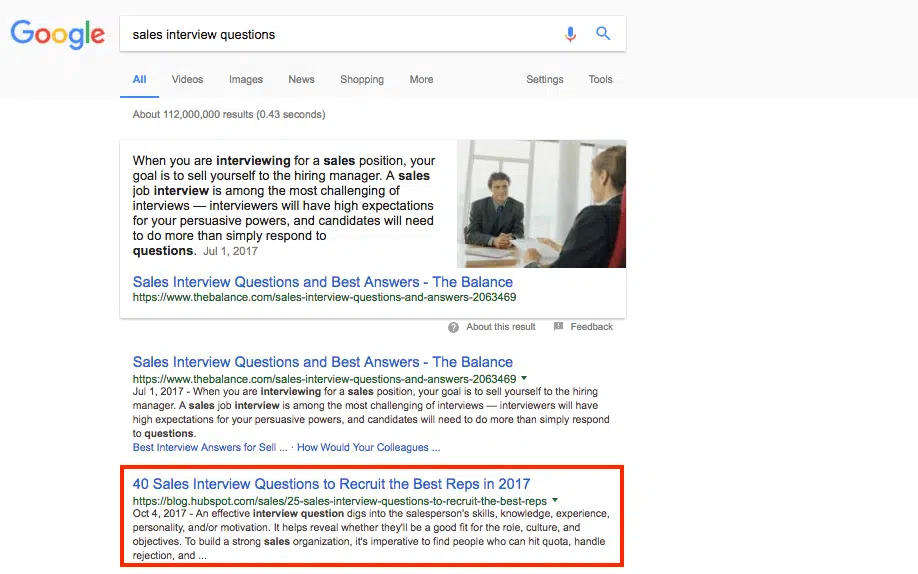 A vous de voir s’il est pertinent ou non d’enrichir votre article pour mieux le faire matcher aux requêtes des internautes. Ça ne l’est pas toujours. Dans le cas de l’article d’HubSpot, il est question d »interviews de commerciaux (salespeople). Il serait bizarre de parler des marketers. Ce serait hors sujet.