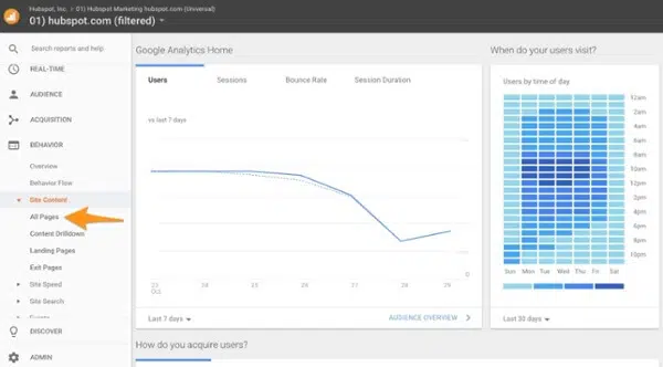 Sur Google Analytics, rendez-vous dans Comportement > Contenu du site > Toutes les pages.