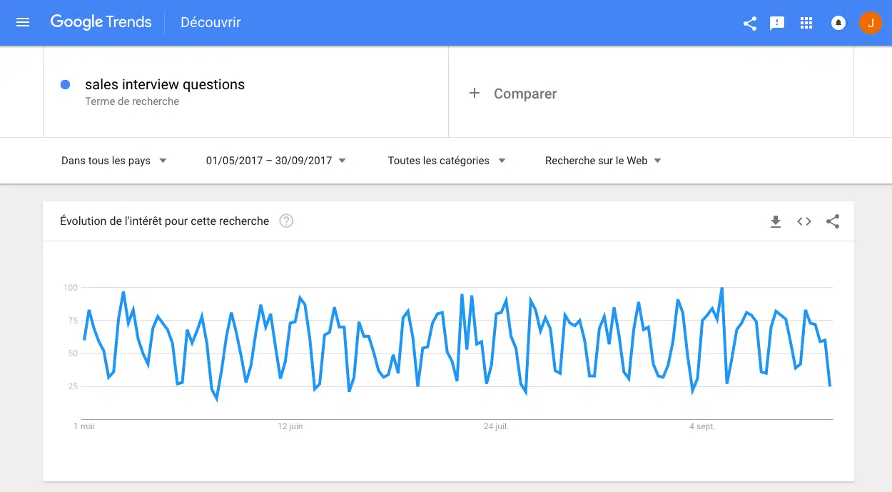 Le mot-clé principal, dans l’article que nous prenons comme exemple, est « Sales Interview Questions ». Si le trafic sur l’article a baissé au cours des derniers mois, c’est peut-être parce que moins de personnes recherchent tapent « Sales Interview Questions » dans Google. Pour en avoir le coeur net, on peut utiliser Google Trends.