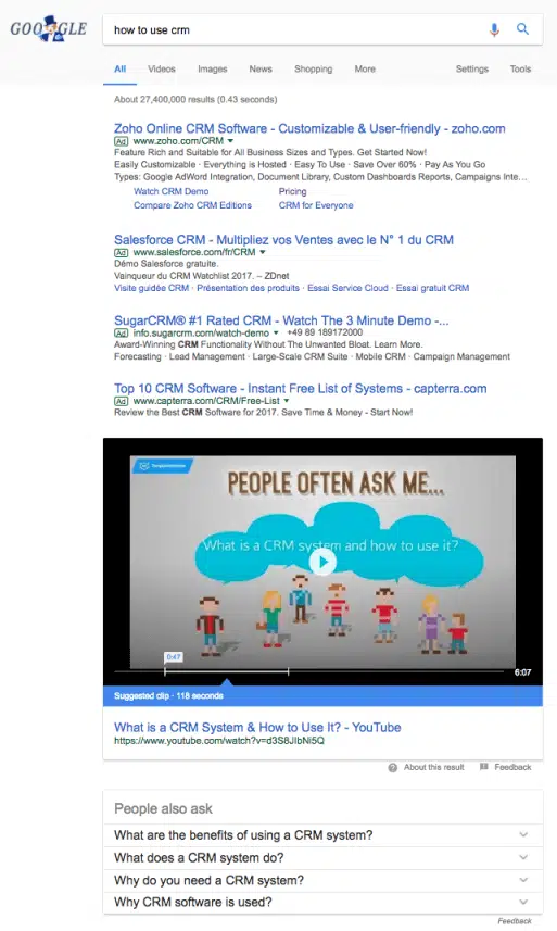 Vous pouvez aussi descendre dans les résultats à cause d’annonces Google Ads (anciennement Google AdWords). Ces annonces sont placées tout en haut des résultats et ont donc pour effet mécanique de rendre moins visible les résultats naturels. Prenons la requête « How to use crm » :